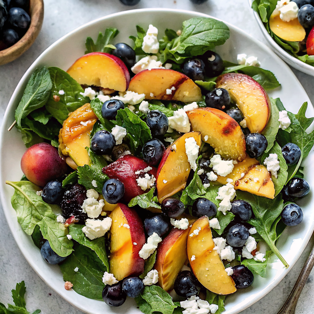 The beauty of this salad lies in its simplicity and the way each ingredient enhances the others. The natural sweetness of ripe peaches provides a perfect counterpoint to the briny richness of feta cheese, while fresh blueberries add bursts of tartness and color. Mixed greens create a fresh foundation, and the honey balsamic dressing ties everything together with its perfect balance of sweet and tangy notes.