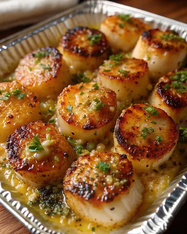 Delicious scallops baked in butter and garlic, perfect as an appetizer or main dish.