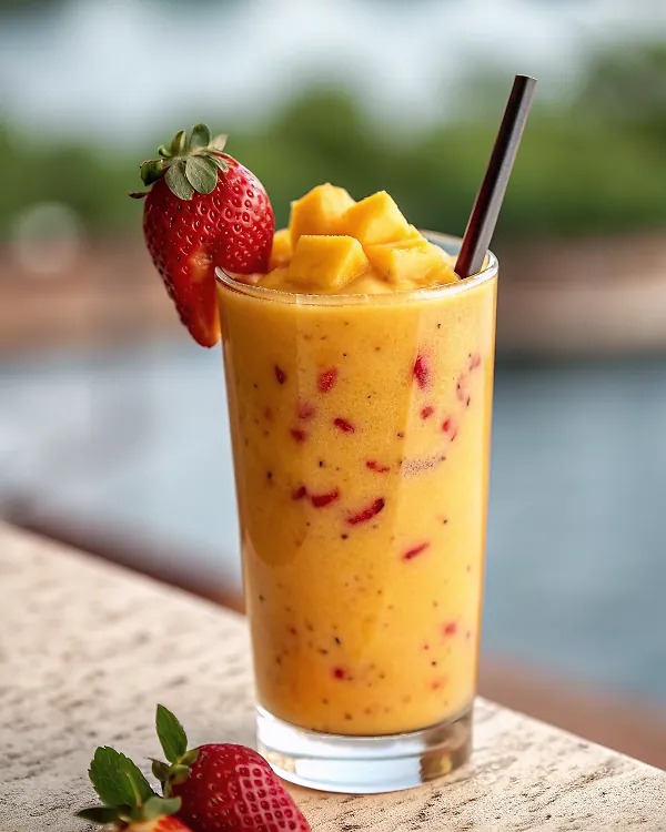Indulge in a tropical Strawberry Mango Smoothie packed with vitamin-rich fruits and veggies. Ready in 5 minutes for a refreshing breakfast. Try today!