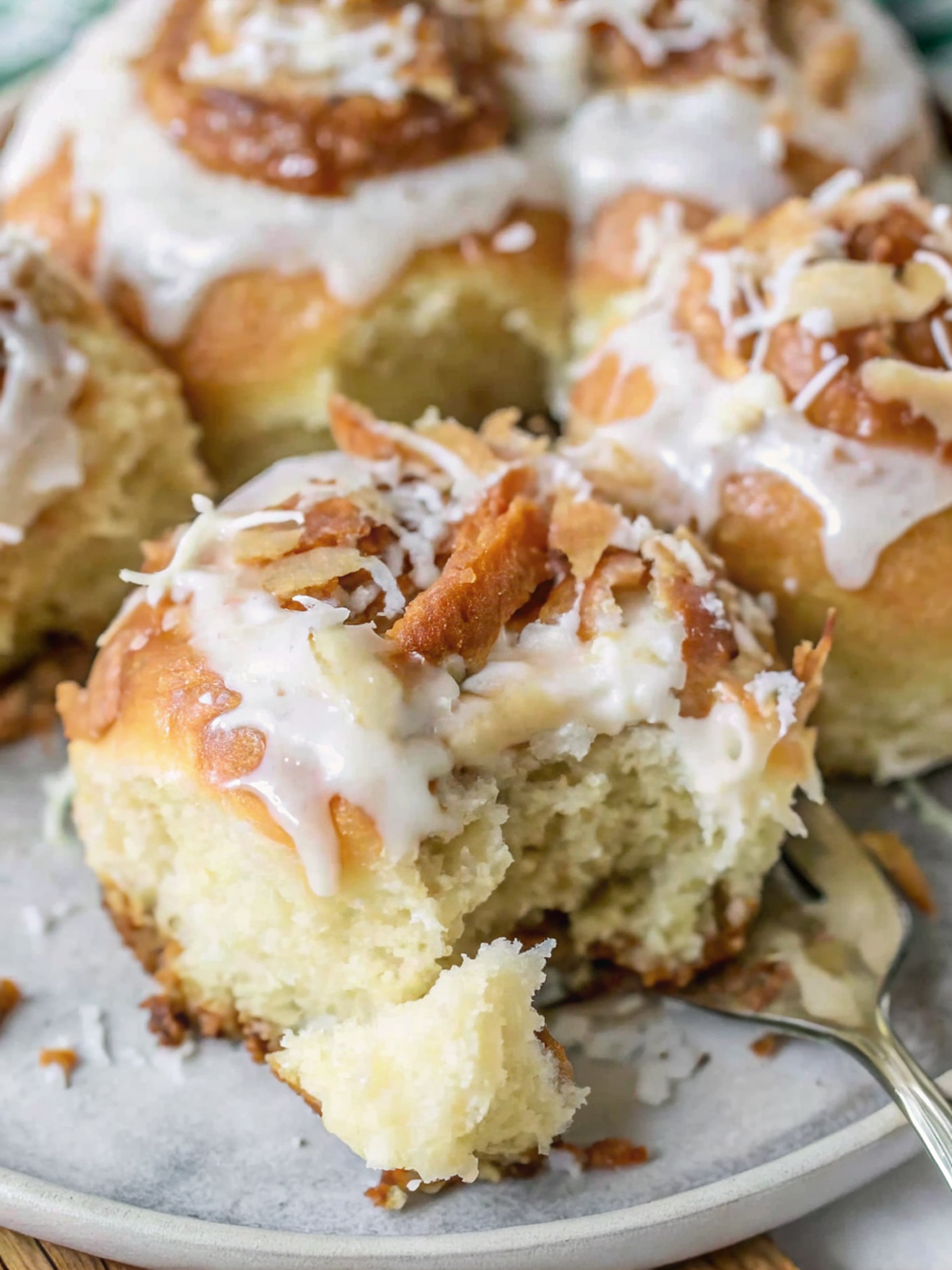 While the rolls cool slightly, whisk together the frosting ingredients until smooth. Spread over warm rolls and sprinkle with toasted coconut flakes for the perfect finish.