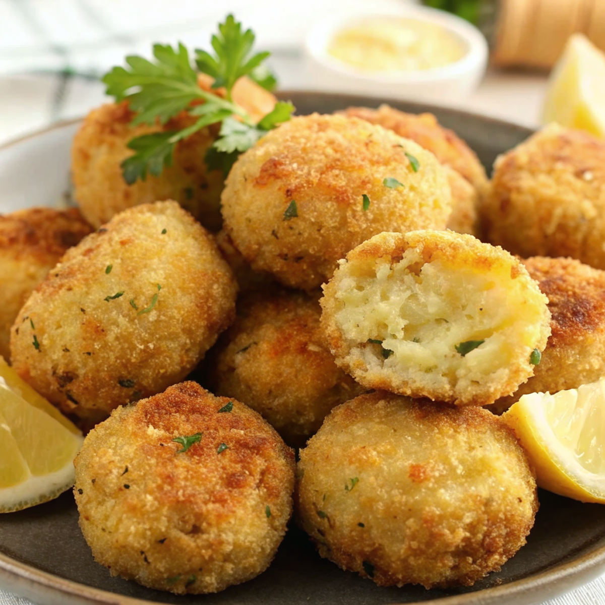 Present these golden croquettes on a rustic wooden board garnished with lemon wedges and fresh parsley sprigs. For elegant entertaining, serve on individual plates with a small dollop of aioli or herb-infused olive oil for dipping. The contrast of the golden exterior against vibrant green herbs creates an appealing visual presentation that’s perfect for both casual family dinners and special occasions.