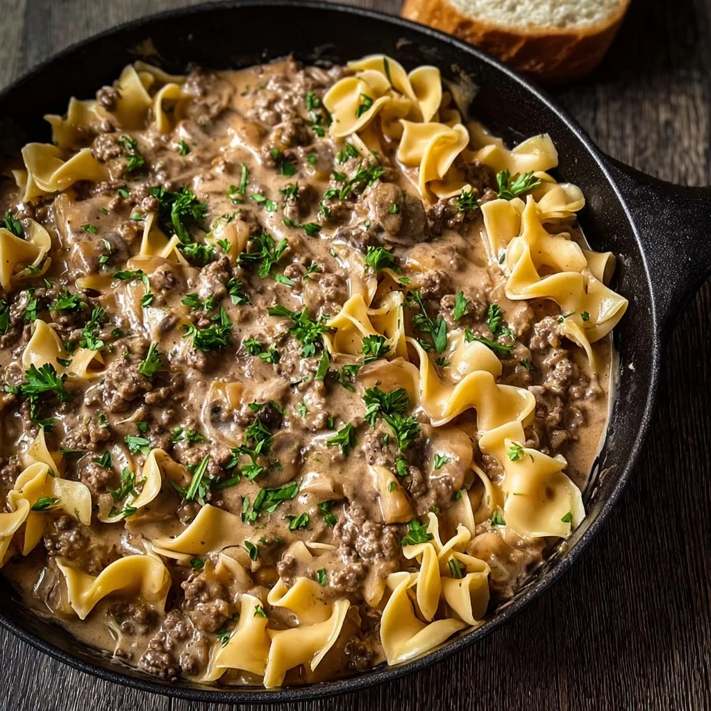 Present this Ground Beef Stroganoff in warmed bowls to maintain temperature, with a sprinkle of fresh parsley and a side of crusty bread. For special occasions, serve in individual cast-iron skillets for an impressive presentation that keeps the dish warm throughout the meal.