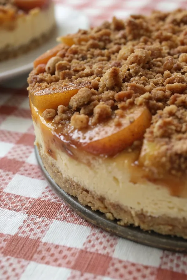 Before serving, top cheesecake with reserved roasted peaches and crumble mixture for beautiful presentation.