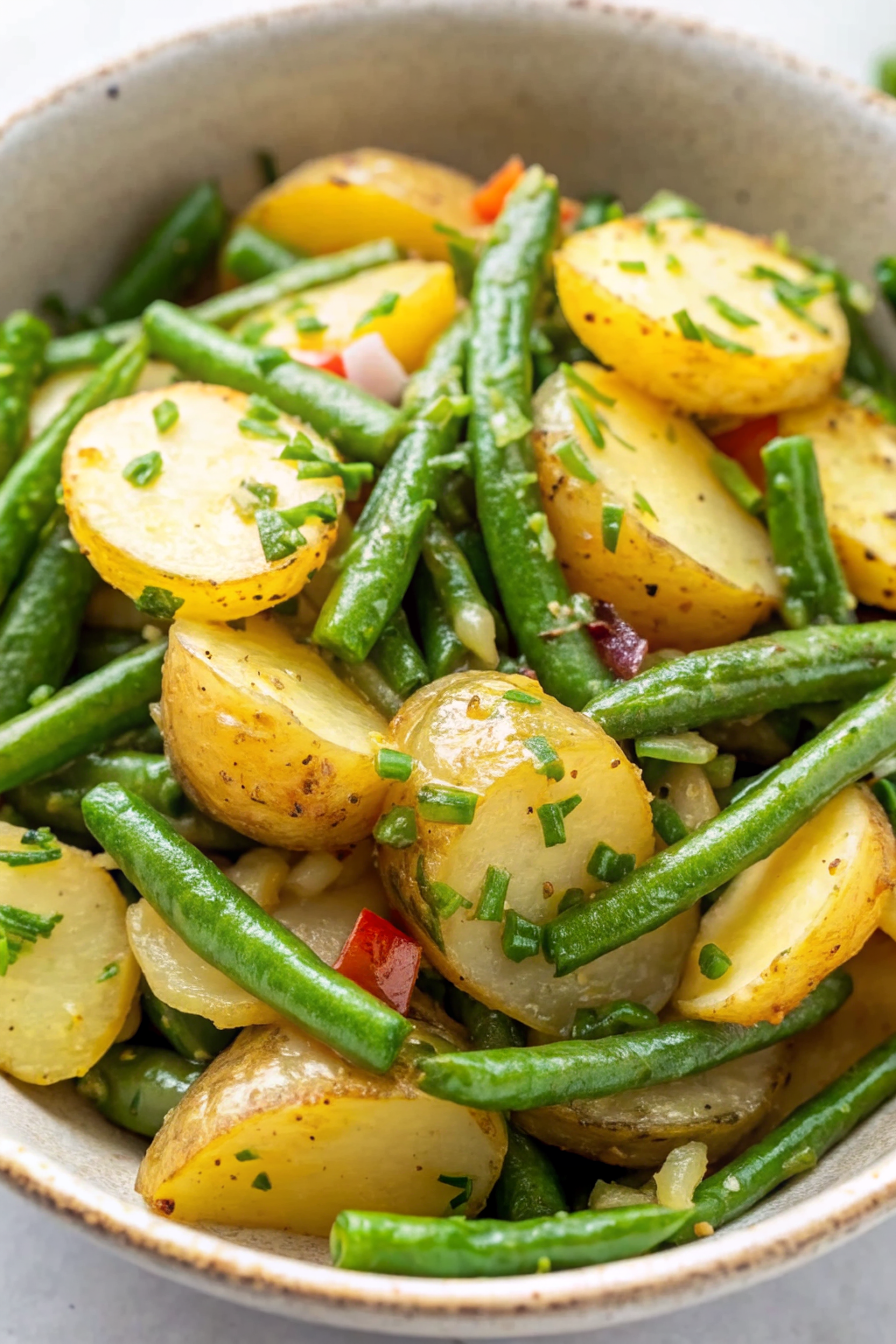 Serve this Quick Green Bean Potato Salad at room temperature or slightly chilled. Present it in a large, shallow bowl to showcase the beautiful colors. Garnish with extra fresh chives and a light sprinkle of freshly cracked black pepper. For special occasions, serve individual portions in small bowls with a sprig of fresh herbs as garnish.