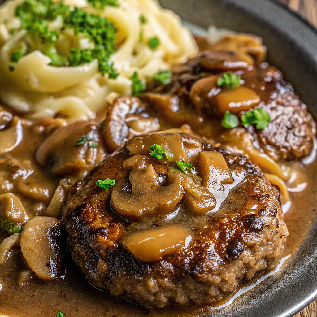 A classic American Salisbury steak smothered in rich brown gravy, perfect for a hearty dinner.